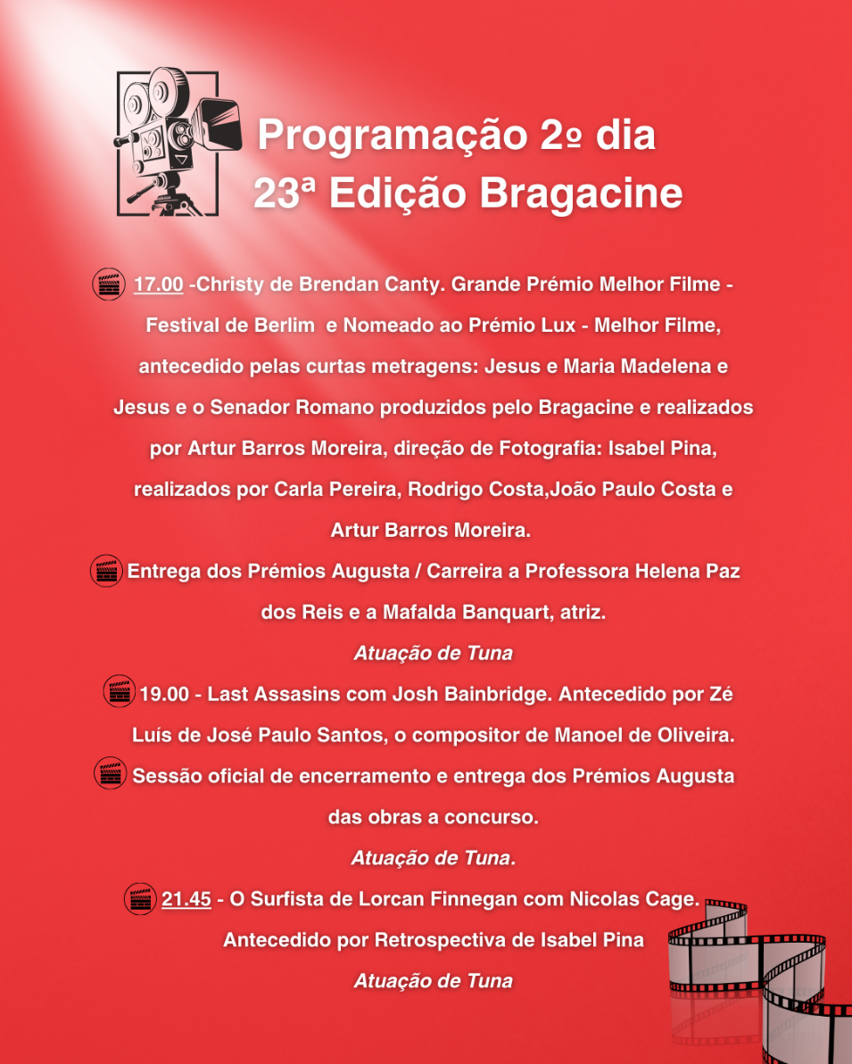 23:45h - Exibição da curta e longa metragem vencedora do Bragacine/Augusta 2014